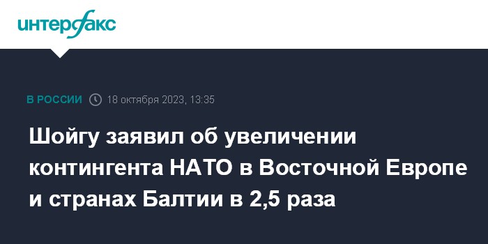 Москва. 18 октября. INTERFAX.RU - Численность войск усиления НАТО в Восточной Европе и странах Балтии с февраля прошлого года возросла в два с половиной раза и превысила 30 тысяч человек, сообщил министр обороны РФ Сергей Шойгу.