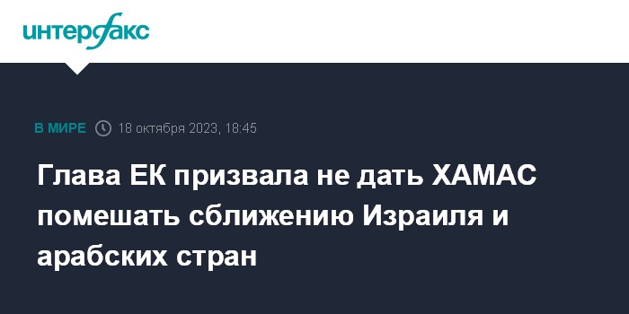 Москва. 18 октября. INTERFAX.RU - Председатель Еврокомиссии Урсула фон дер Ляйен опасается, что действия ХАМАС могут помешать налаживанию отношений Израиля с арабским миром. Она заявила об этом на пленарной сессии Европарламента.