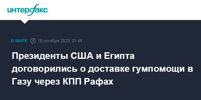 "Президенты двух стран договорились о доставке гуманитарной помощи в сектор Газа через контрольно-пропускной пункт Рафах на постоянной основе, при этом соответствующие власти двух стран координируют свои действия с международными гуманитарными организациями под наблюдением Организации Объединенных Наций для обеспечения доставки помощи", - говорится в сообщении, опубликованном на сайте администрации президента Египта.