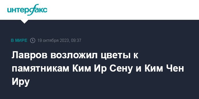 Москва. 19 октября. INTERFAX.RU - Министр иностранных дел РФ Сергей Лавров в ходе визита в Северную Корею принял участие в ряде памятных мероприятий, свою программу он начал с возложения цветов к памятникам двум первым лидерам республики Ким Ир Сену и Ким Чен Иру.
