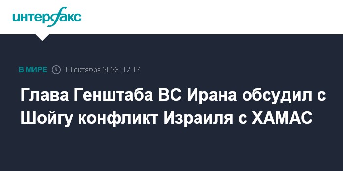 Москва. 19 октября. INTERFAX.RU - Начальник Генштаба ВС Ирана генерал-майор Мохаммад Багери в разговоре с министром обороны РФ Сергеем Шойгу обсудил ситуацию в секторе Газа, сообщает в четверг агентство "Тасним".