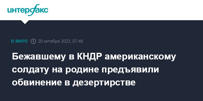 Москва. 20 октября. INTERFAX.RU - Власти США предъявили военнослужащему Трэвису Кингу, бежавшему в КНДР и возвращенному на родину, обвинения по ряду пунктов, включая дезертирство, сообщает телеканал CBS News.