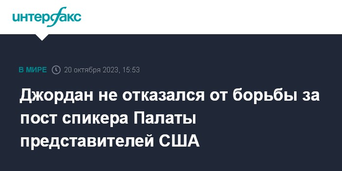 Москва. 20 октября. INTERFAX.RU - Член палаты представителей от Огайо республиканец Джим Джордан в пятницу дал понять, что будет продолжать бороться за пост спикера Палаты представителей конгресса США.