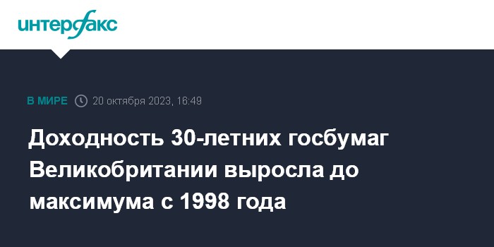 Москва. 20 октября. INTERFAX.RU - Доходность 30-летних гособлигаций Великобритании выросла 20 октября до максимума с 1998 года на фоне усиливающихся ожиданий, что Банку Англии придется удерживать базовую ставку на высоком уровне в течение длительного времени.