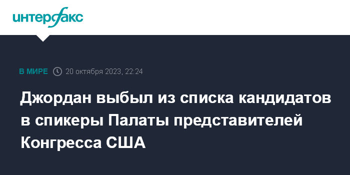 Москва. 20 октября. INTERFAX.RU - Республиканцы в пятницу сняли кандидатуру Джима Джордана, который выдвигался на должность спикера палаты представителей Конгресса США, передает CNN.