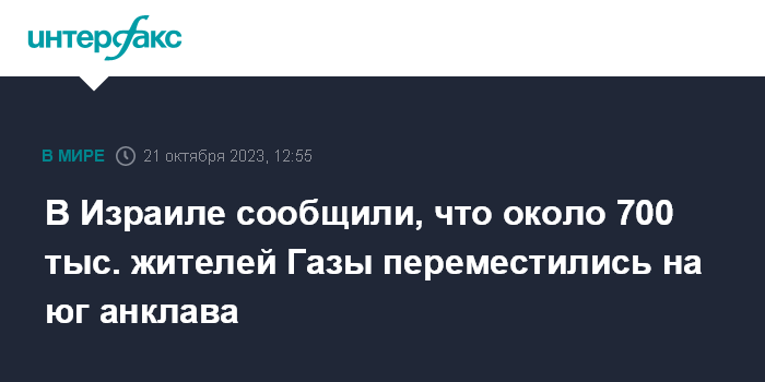 Москва. 21 октября. INTERFAX.RU - Примерно 700 тыс. жителей сектора Газа ушли на юг анклава, сообщает в субботу The Times of Israel со ссылкой на неназванного представителя служб безопасности Израиля.