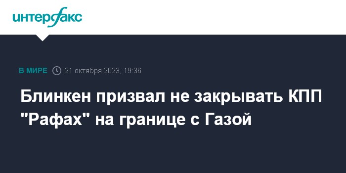 Москва. 21 октября. INTERFAX.RU - Государственный секретарь США Энтони Блинкен заявил о необходимости оставить открытым КПП "Рафах" на границе между Египтом и сектором Газа. Обращение Блинкена опубликовали на сайте Госдепа.