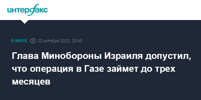 Москва. 22 октября. INTERFAX.RU - Министр обороны Израиля Йоав Галант заявил, что готовящаяся наземная операция израильской армии в секторе Газа может продлиться до трех месяцев и будет последней, если Израиль уничтожит ХАМАС, сообщает The Times of Israel.