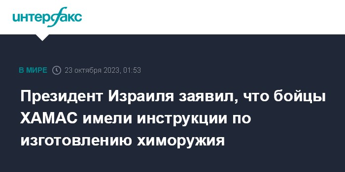 Москва. 23 октября. INTERFAX.RU - Президент Израиля Ицхак Герцог утверждает, что представители ХАМАС при вторжении в Израиль 7 октября имели при себе инструкции по изготовлению химического оружия.