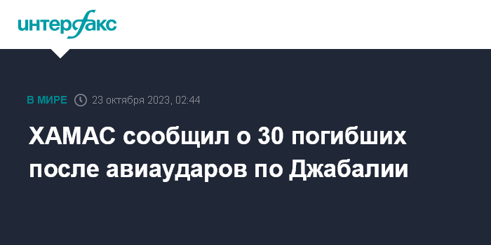 Москва. 23 октября. INTERFAX.RU - В результате израильских авиаударов по лагерю беженцев Джабалия погибли 30 человек, сообщает телеканал Al-Jazeera со ссылкой на местные силы гражданской обороны.
