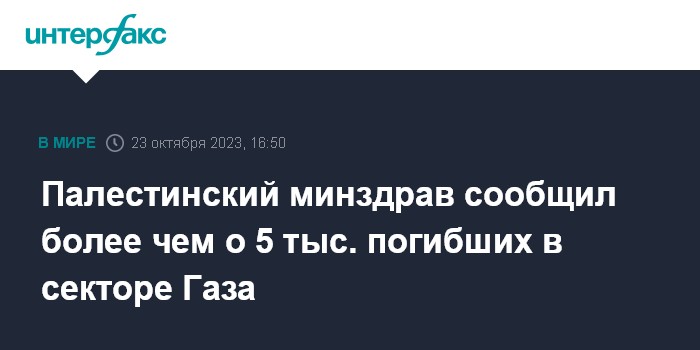 Москва. 23 октября. INTERFAX.RU - Число жертв авиаударов со стороны Израиля по сектору Газа выросло до 5 087 человек, сообщают ближневосточные СМИ со ссылкой на палестинское министерство здравоохранения.