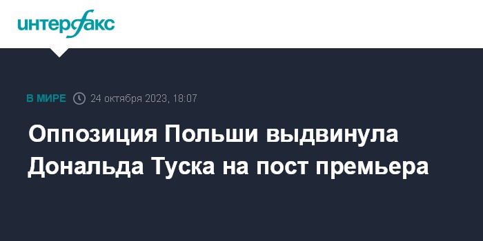 Москва. 24 октября. INTERFAX.RU - Лидеры оппозиционных партий, получивших большинство мест в польском парламенте, выдвинули главу "Гражданской коалиции" Дональда Туска кандидатом на пост премьер-министра, сообщает во вторник Associated Press.