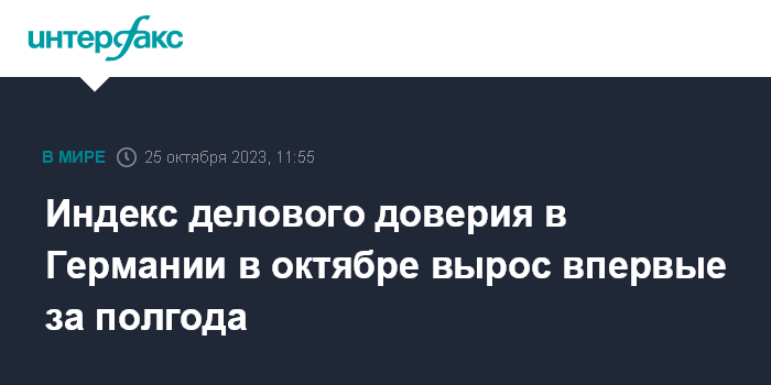 Москва. 25 октября. INTERFAX.RU - Индекс доверия германских предпринимателей к экономике страны увеличился в октябре впервые за шесть месяцев и оказался лучше прогнозов рынка.
