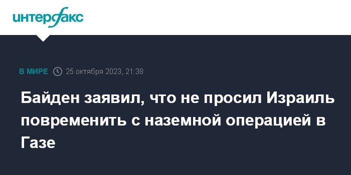 Москва. 25 октября. INTERFAX.RU - Президент США Джо Байден заверил, что не просил израильское руководство не проводить наземную операцию в секторе Газа до тех пор, пока не удастся освободить удерживаемых там заложников.