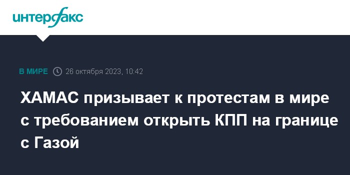 Москва. 26 октября. INTERFAX.RU - Группировка ХАМАС призывает провести массовые протесты в Израиле, на Западном берегу реки Иордан и в странах мусульманского мира в пятницу и воскресенье, требуя открыть контрольно-пропускной пункт (КПП) "Рафах" на границе Египта с сектором Газа, сообщает The Times of Israel.
