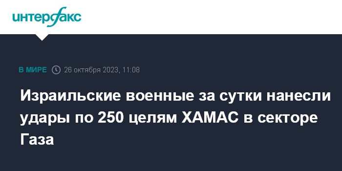 Москва. 26 октября. INTERFAX.RU - Армия обороны Израиля (ЦАХАЛ) в четверг сообщила, что за прошедшие сутки атаковала около 250 объектов палестинской группировки ХАМАС в секторе Газа.