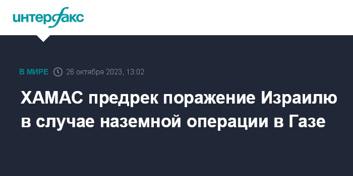 Москва. 26 октября. INTERFAX.RU - В группировке ХАМАС заявили, что Израиль потерпит поражение в случае, если начнет наземную операцию в секторе Газа, сообщает в четверг "Аль-Арабия".