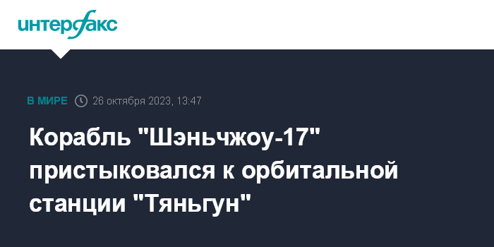 Москва. 26 октября. INTERFAX.RU - Китайский пилотируемый корабль "Шэньчжоу-17" с экипажем из трех тайконавтов в четверг успешно состыковался с Национальной орбитальной станцией "Тяньгун". Об этом сообщило Управление программы пилотируемых полетов КНР (CMSA).