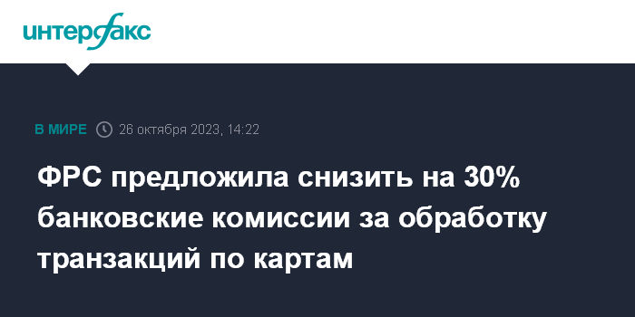 Москва. 26 октября. INTERFAX.RU - Федеральная резервная система (ФРС) предложила снизить примерно на 30% комиссии, взимаемые банками в США с торговых организаций при оплате их клиентами покупок с помощью дебетовых карт.