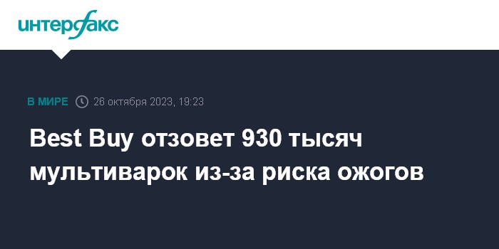 Москва. 26 октября. INTERFAX.RU - Американская сеть магазинов электроники Best Buy Co. отзывает около 930 тысяч мультиварок бренда Insignia из-за риска серьезных ожогов пользователей.