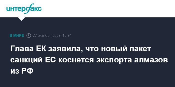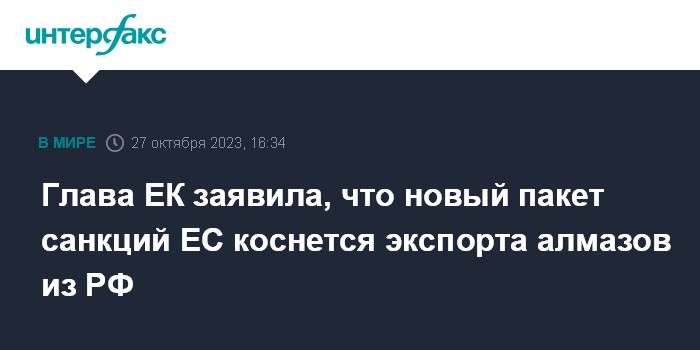 Москва. 27 октября. INTERFAX.RU - В готовящемся 12-м пакете санкций ЕС попытается уменьшить доходы РФ от экспорта алмазов в Евросоюз, заявила в пятницу председатель Еврокомиссии Урсула фон дер Ляйен.