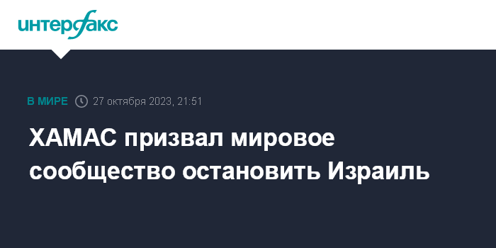 Москва. 27 октября. INTERFAX.RU - Группировка ХАМАС призвала мировое сообщество срочно остановить авиаудары и операции армии обороны Израиля в секторе ГАЗА, сообщают ближневосточные СМИ.