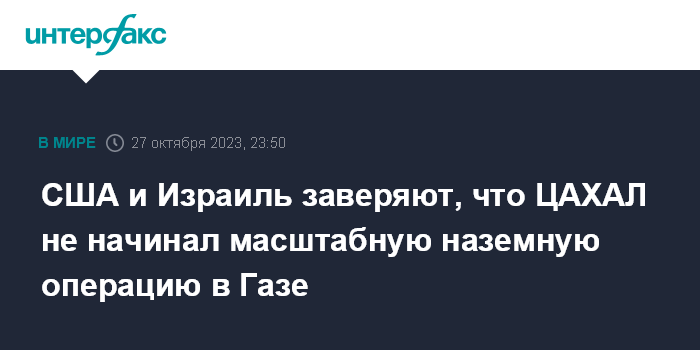 Москва. 27 октября. INTERFAX.RU - Боевые действия, проводимые в ночь на субботу армией обороны Израиля (ЦАХАЛ) на территории сектора Газа, не нужно считать началом масштабной наземной операции, заявили американские и израильские официальные лица.