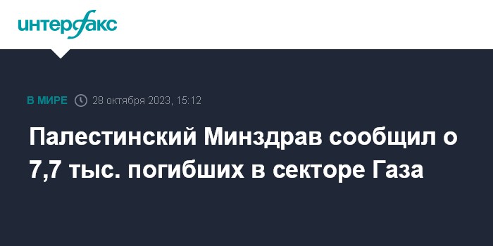 Москва. 28 октября. INTERFAX.RU - Число жертв ударов Израиля по сектору Газа возросло до 7 703 человек, сообщают в субботу западные СМИ со ссылкой на палестинский Минздрав.