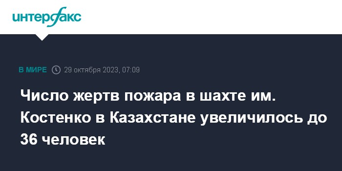 Москва. 29 октября. INTERFAX.RU - Число погибших при пожаре на шахте им. Костенко в Караганде (административный центр Карагандинской области) увеличилось до 36 человек, сообщила пресс-служба компании "АрселорМиттал Темиртау".