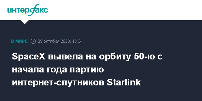 Москва. 29 октября. INTERFAX.RU - Ракета-носитель Falcon 9 в воскресенье успешно вывела на орбиту очередную партию из 22 мини-спутников для пополнения орбитальной группировки глобальной сети интернет-покрытия системы Starlink, сообщила компания-разработчик SpaceX.