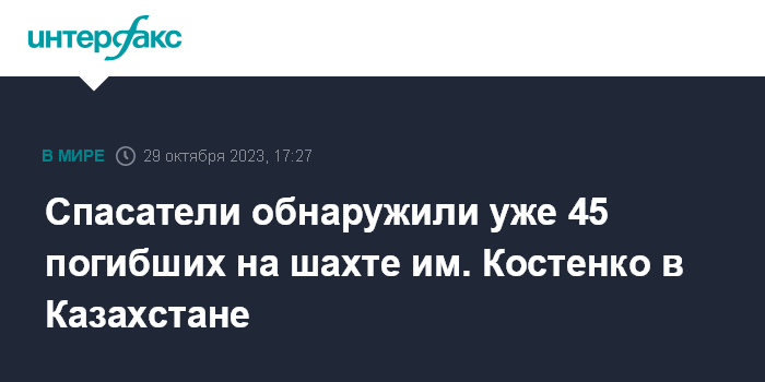 Москва. 29 октября. INTERFAX.RU - Число погибших при аварии на шахте им.Костенко в Караганде увеличилось до 45 человек, сообщает в воскресенье пресс-служба МЧС республики.