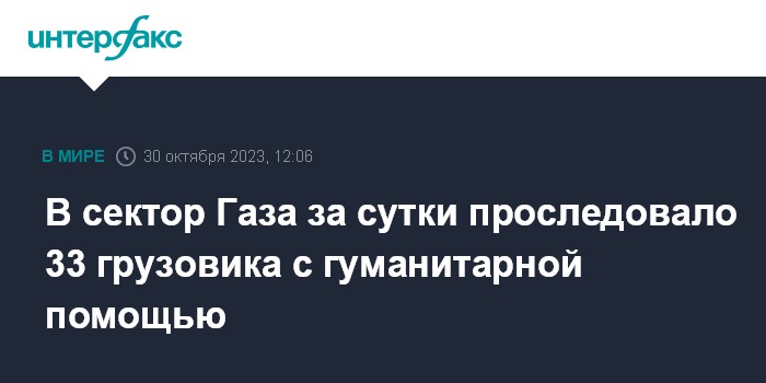 Москва. 30 октября. INTERFAX.RU - За минувшие сутки в сектор Газа прибыли 33 грузовика с гуманитарной помощью через КПП "Рафах" на границе с Египтом, пишет The Times of Israel со ссылкой на Управление ООН по координации гуманитарных вопросов (УКГВ, OCHA).