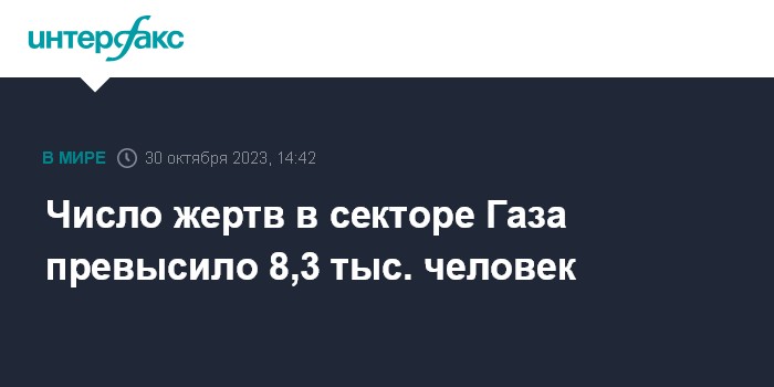 Москва. 30 октября. INTERFAX.RU - В результате израильских авиаударов по сектору Газа погибли около 8,3 тыс. человек, сообщает в понедельник "Аль-Джазира" со ссылкой на палестинские медслужбы.