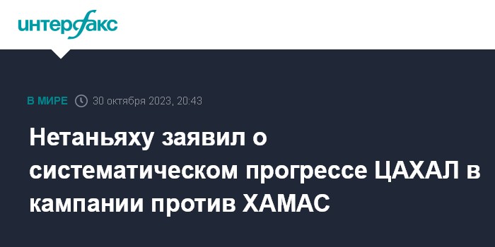 Москва. 30 октября. INTERFAX.RU - Израильский премьер-министр Биньямин Нетаньяху в понедельник заявил, что Армия обороны Израиля (ЦАХАЛ) постепенно добивается поставленных командованием целей в операции против группировки ХАМАС.