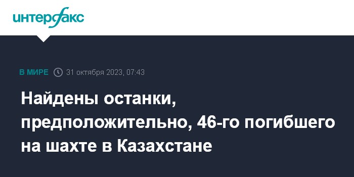 Москва. 31 октября. INTERFAX.RU - По предварительным данным, обнаружены останки 46-го горняка, пропавшего при аварии на шахте им. Костенко "АрселорМиттал Темиртау", сообщил министр по чрезвычайным ситуациям Казахстана Сырым Шарипханов.