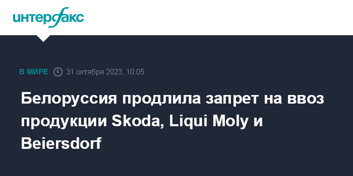 Москва. 31 октября. INTERFAX.RU - Правительство Белоруссии продлило до конца 2024 года введенный в мае 2021 года запрет на ввоз продукции Skoda, Liqui Moly и Beiersdorf (владеет, в частности, торговой маркой Nivea), соответствующее постановление совета министров опубликовано на Национальном правовом интернет-портале.