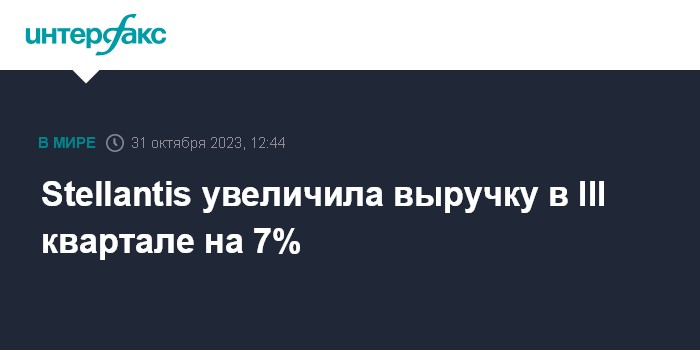 Москва. 31 октября. INTERFAX.RU - Автопроизводитель Stellantis NV, образованный в результате слияния Fiat Chrysler и PSA Group, увеличил выручку в третьем квартале 2023 года на 7% благодаря наращиванию поставок автомобилей.
