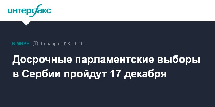 Москва. 1 ноября. INTERFAX.RU - Президент Сербии Александр Вучич назначил досрочные парламентские выборы на 17 декабря, сообщает AP. Парламентские выборы в стране пройдут в третий раз за последние четыре года.