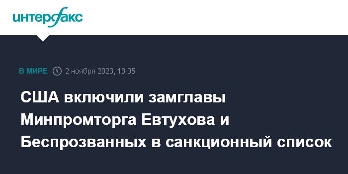Москва. 2 ноября. INTERFAX.RU - OFAC (Office of Foreign Assets Control, подразделение Минфина США, отвечающее за правоприменение в области санкций) внесло в санкционный список заместителей министра промышленности и торговли РФ Виктора Евтухова и Алексея Беспрозванных, говорится в материалах американского ведомства.
