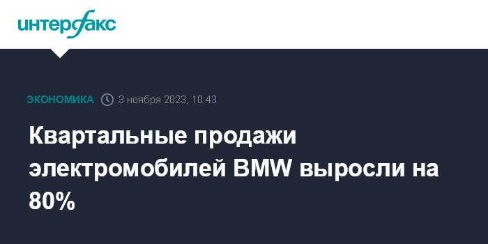 Москва. 3 ноября. INTERFAX.RU - В III квартале 2023 года германский автопроизводитель Bayerische Motoren Werke AG увеличил продажи электромобилей на 80%, до 93 931 штуки, а их доля в общем объеме продаж увеличилась до 15,1% с 8,9% годом ранее.
