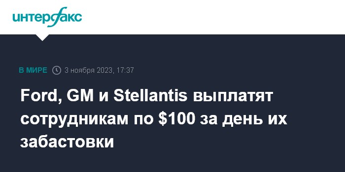 Москва. 3 ноября. INTERFAX.RU - Ford Motor Co., General Motors Co. (GM) и Stellantis NV заплатят бастовавшим сотрудникам в среднем чуть более чем по $100 за каждый день их участия в забастовке, пишет The Wall Street Journal.