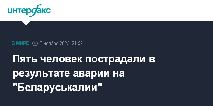 Москва. 3 ноября. INTERFAX.RU - Пять человек пострадали в результате аварии на белорусском предприятии по производству калийных удобрений. Все они с тяжелыми травмами направлены в Солигорскую районную больницу, сообщили в Минздраве республики.