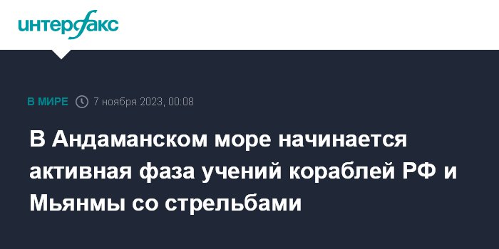 Москва. 7 ноября. INTERFAX.RU - Практическая часть учений кораблей России и Мьянмы пройдет с 7 по 9 ноября в Андаманском море, запланированы артиллерийские стрельбы.