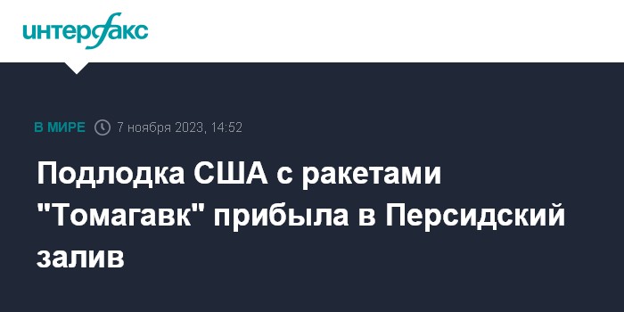 Москва. 7 ноября. INTERFAX.RU - Американская атомная подводная лодка (АПЛ) класса "Огайо" USS Florida с крылатыми ракетами "Томагавк" вошла в Персидский залив с целью предостеречь Иран от агрессивных действий. Об этом сообщает во вторник Bloomberg со ссылкой на Минобороны США.