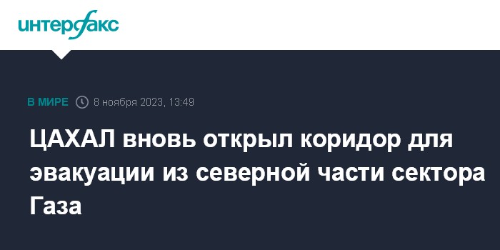 Москва. 8 ноября. INTERFAX.RU - Армия обороны Израиля (ЦАХАЛ) возобновила работу гуманитарного коридора для безопасного перемещения мирных жителей сектора Газа с севера на юг анклава, сообщает The Times of Israel.