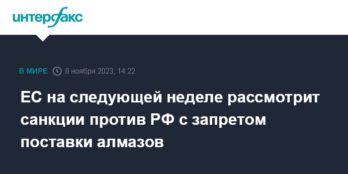 Москва. 8 ноября. INTERFAX.RU - Евросоюз собирается на следующей неделе представить новый пакет антироссийских санкций, который включает запрет на поставку алмазов из России, сообщил глава дипломатии ЕС Жозеп Боррель.