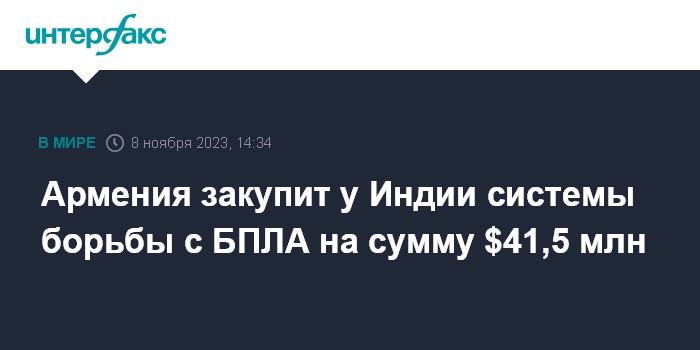 Москва. 8 ноября. INTERFAX.RU - Армения закупит у Индии системы противодействия беспилотным летательным аппаратам (БПЛА) на сумму $41,5 млн в рамках оборонного контракта на $245 млн, сообщает госинформагентство "Арменпресс" со ссылкой на Eurasian Times.
