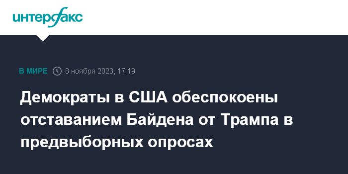 Москва. 8 ноября. INTERFAX.RU - Сенаторы от Демократической партии США выражают обеспокоенность в связи с результатами недавних предвыборных опросов, которые прогнозируют, что нынешний президент страны Джо Байден, вероятно, проиграет бывшему главе государства Дональду Трампу в случае их противостояния на выборах 2024 года, пишет издание The Hill.