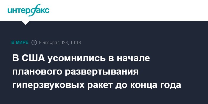 Москва. 9 ноября. INTERFAX.RU - Армии США, по всей видимости, не удастся придерживаться графика и до конца 2023 года приступить к оснащению своего первого подразделения гиперзвуковыми ракетами, сообщает Defense news со ссылкой на помощника министра армии США по закупкам, логистике и технологиям Дага Буша.
