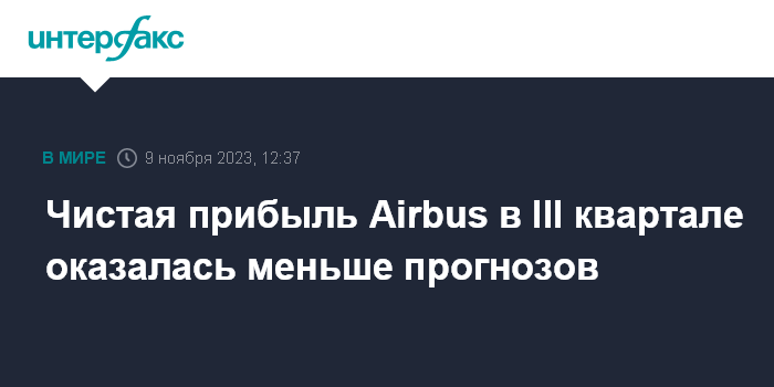 Москва. 9 ноября. INTERFAX.RU - Европейская аэрокосмическая корпорация Airbus SE увеличила чистую прибыль в третьем квартале 2023 года на 21%, выручку - на 12%.